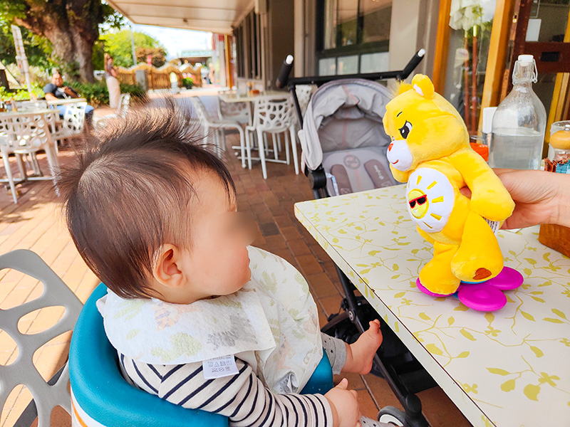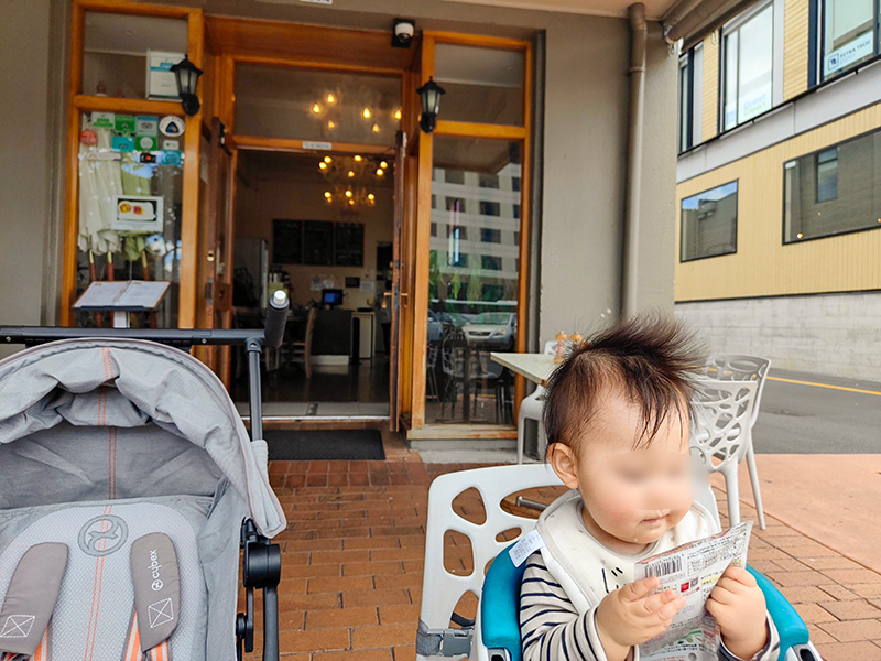 天気が良かったのでテラス席で。店員さんがベビー用の椅子を取り付けてくれました。