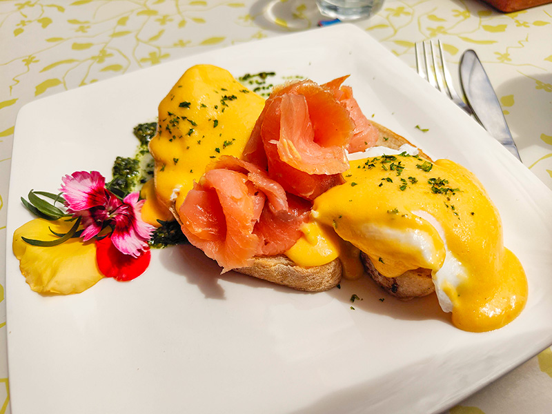 おっくんはエッグベネディクトを頼んでいました。サーモン美味しそう。グーグルマップでも、結構エッグベネディクト推しのコメントが多かったです。
