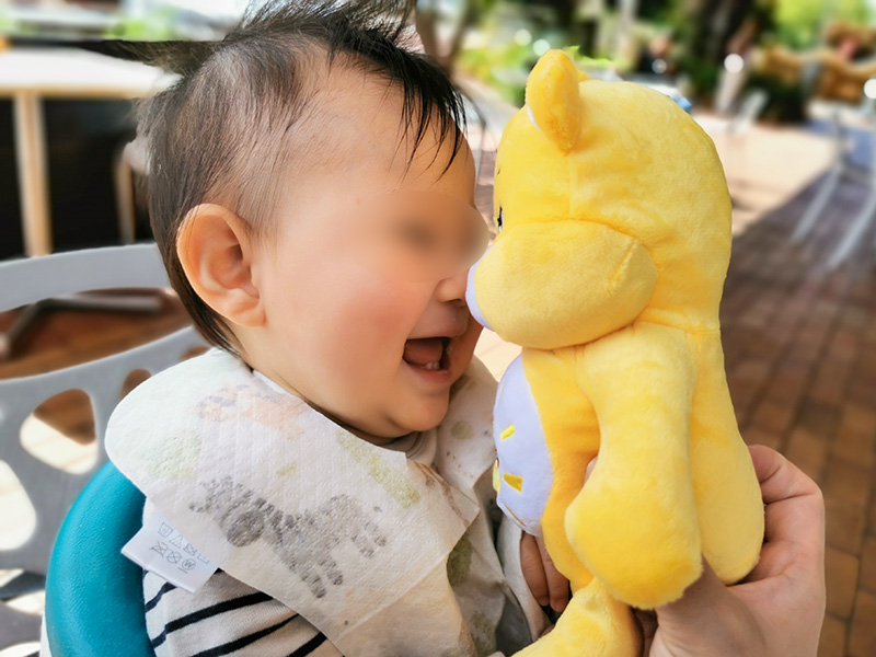 坊は黄色いクマのぬいぐるみを気に入った様子。